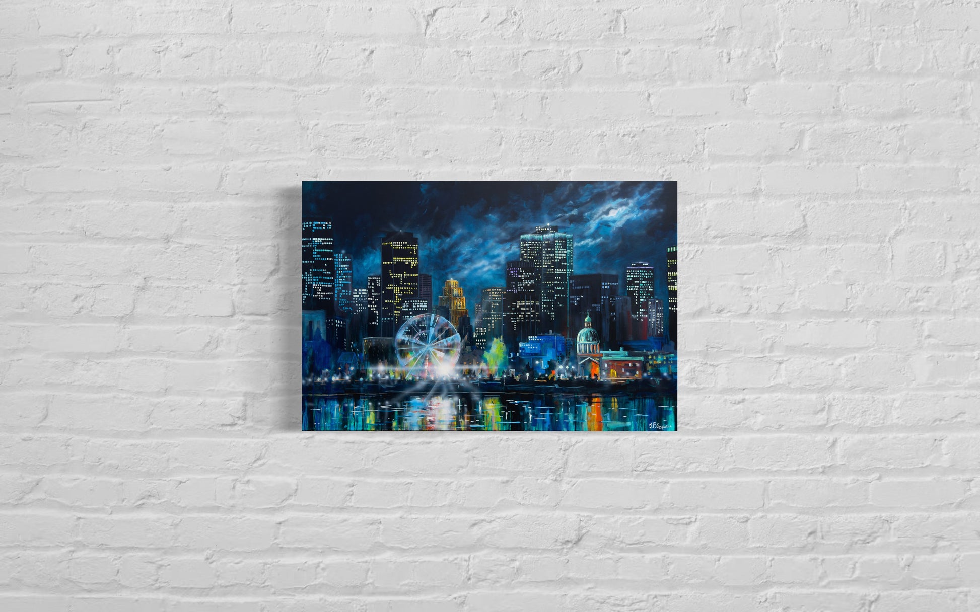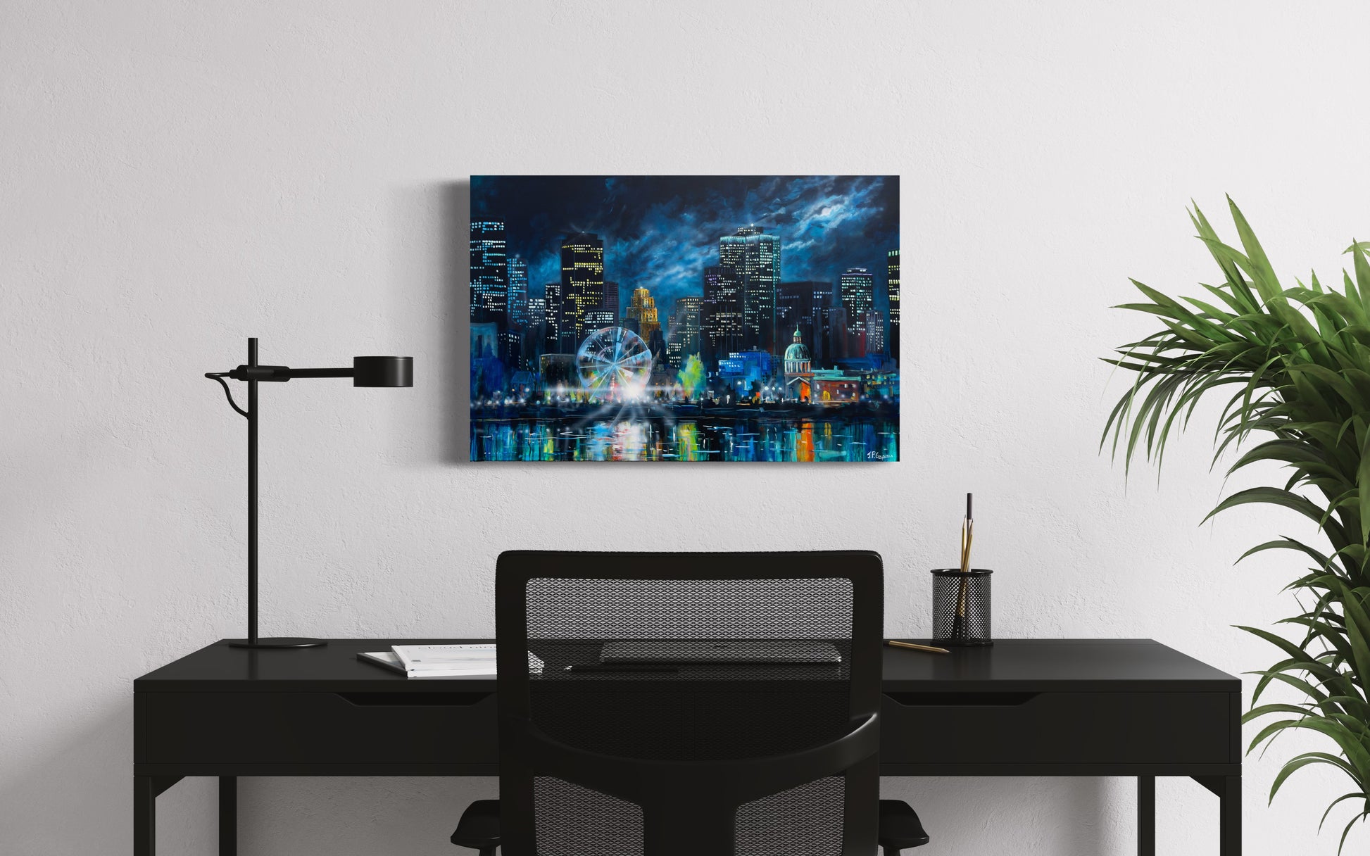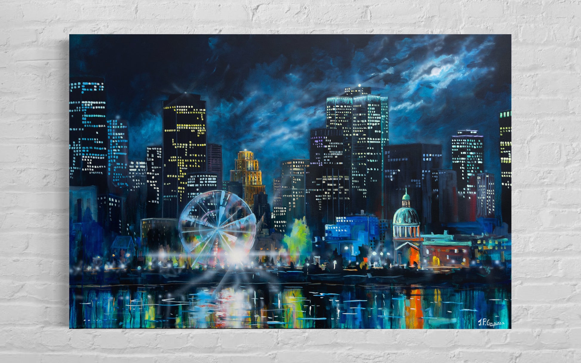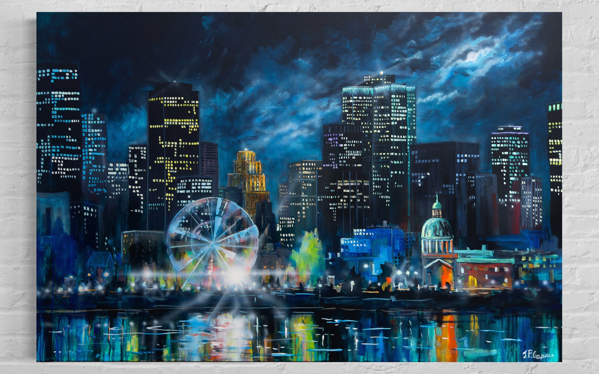 Reproduction from the “Chromacité” collection, this painting captures the nocturnal splendor of Montreal. The Ferris Wheel and iconic buildings are reflected in the water under a blue starry sky, creating a scene full of magic and color.