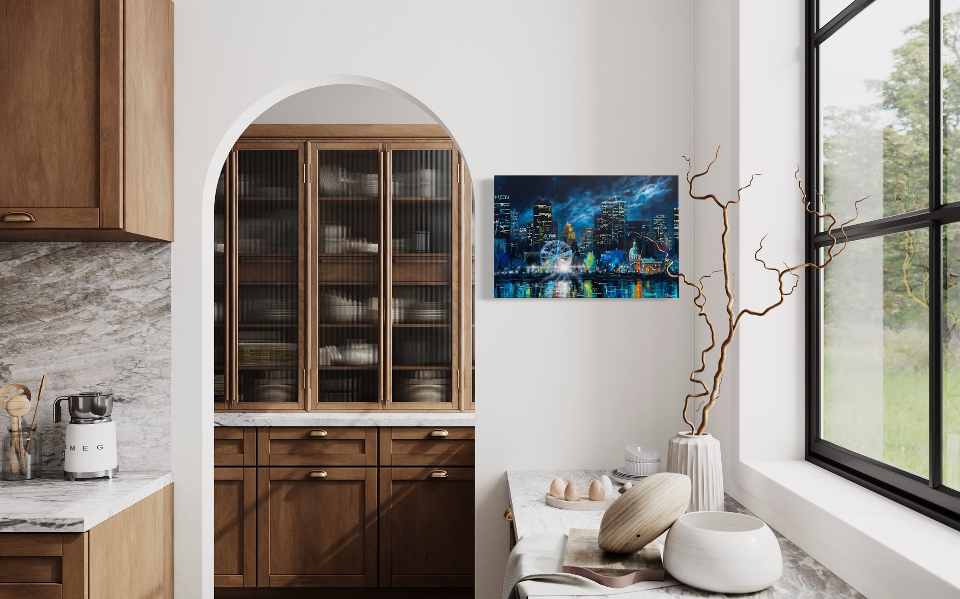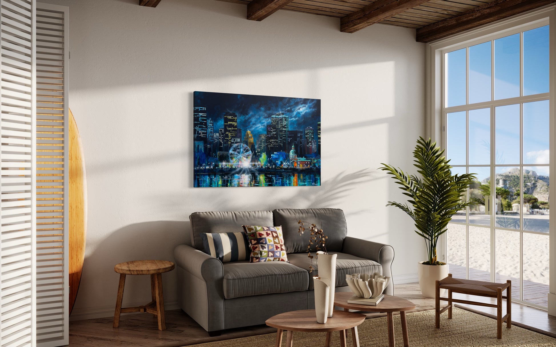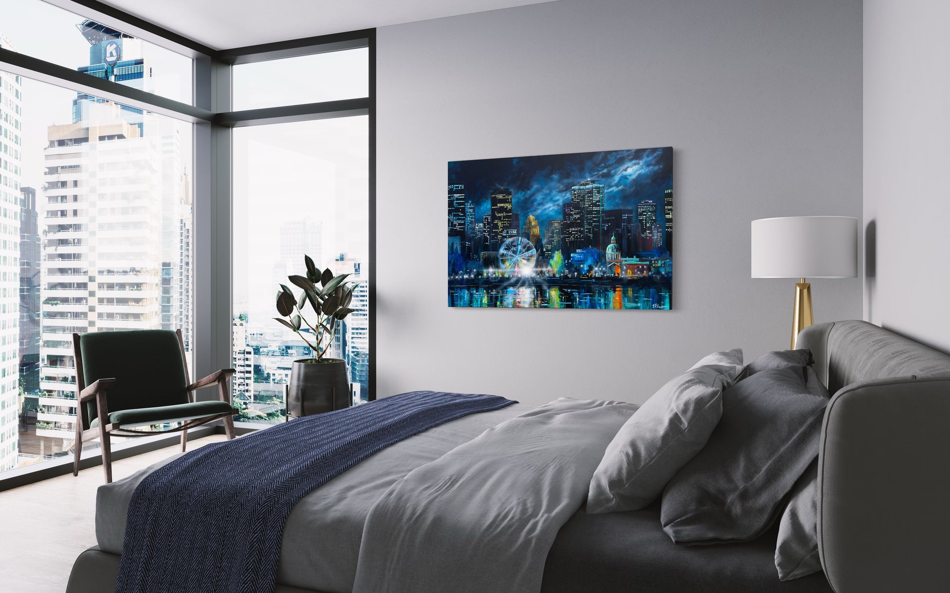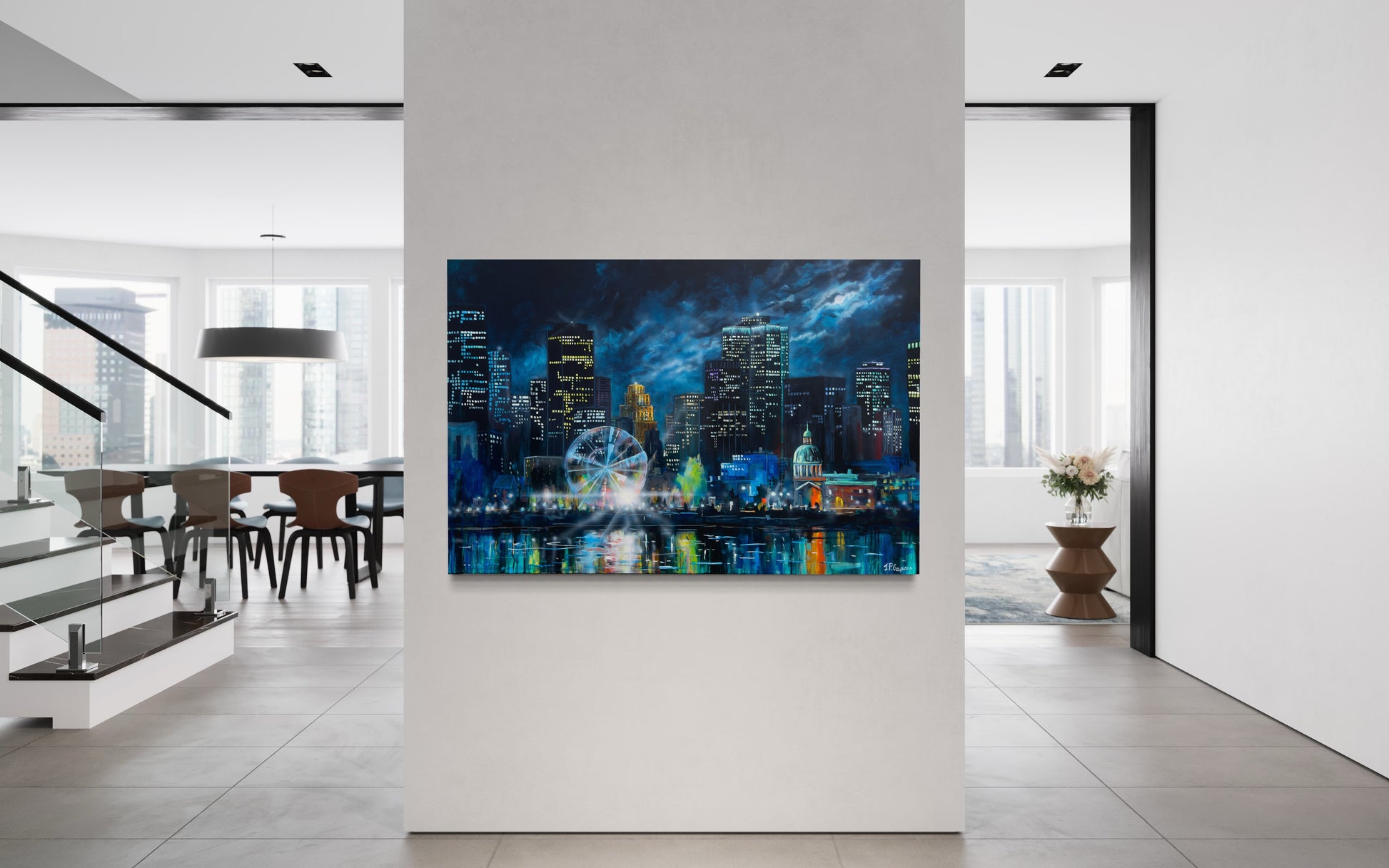 Reproduction from the “Chromacité” collection, this painting captures the nocturnal splendor of Montreal. The Ferris Wheel and iconic buildings are reflected in the water under a blue starry sky, creating a scene full of magic and color.