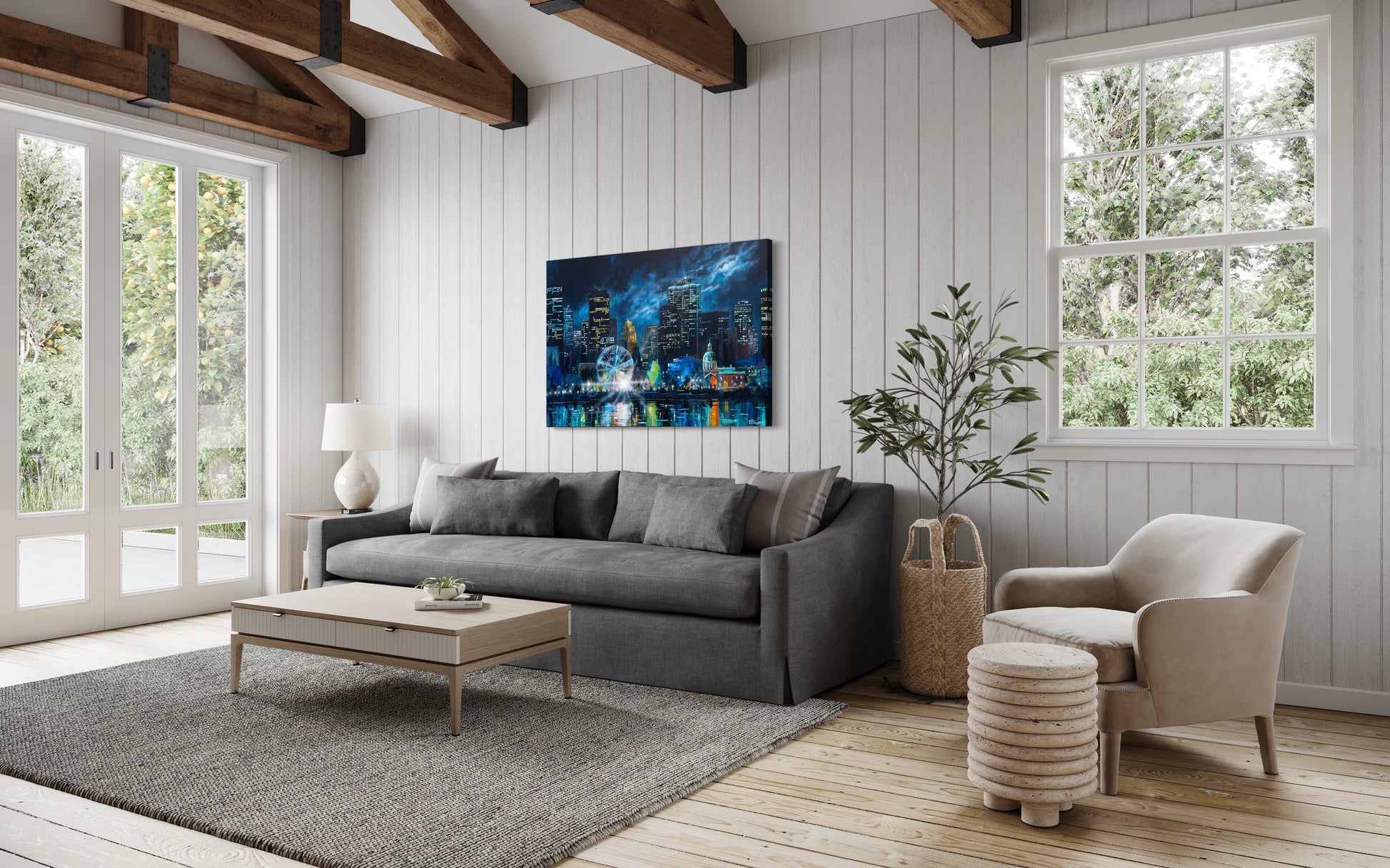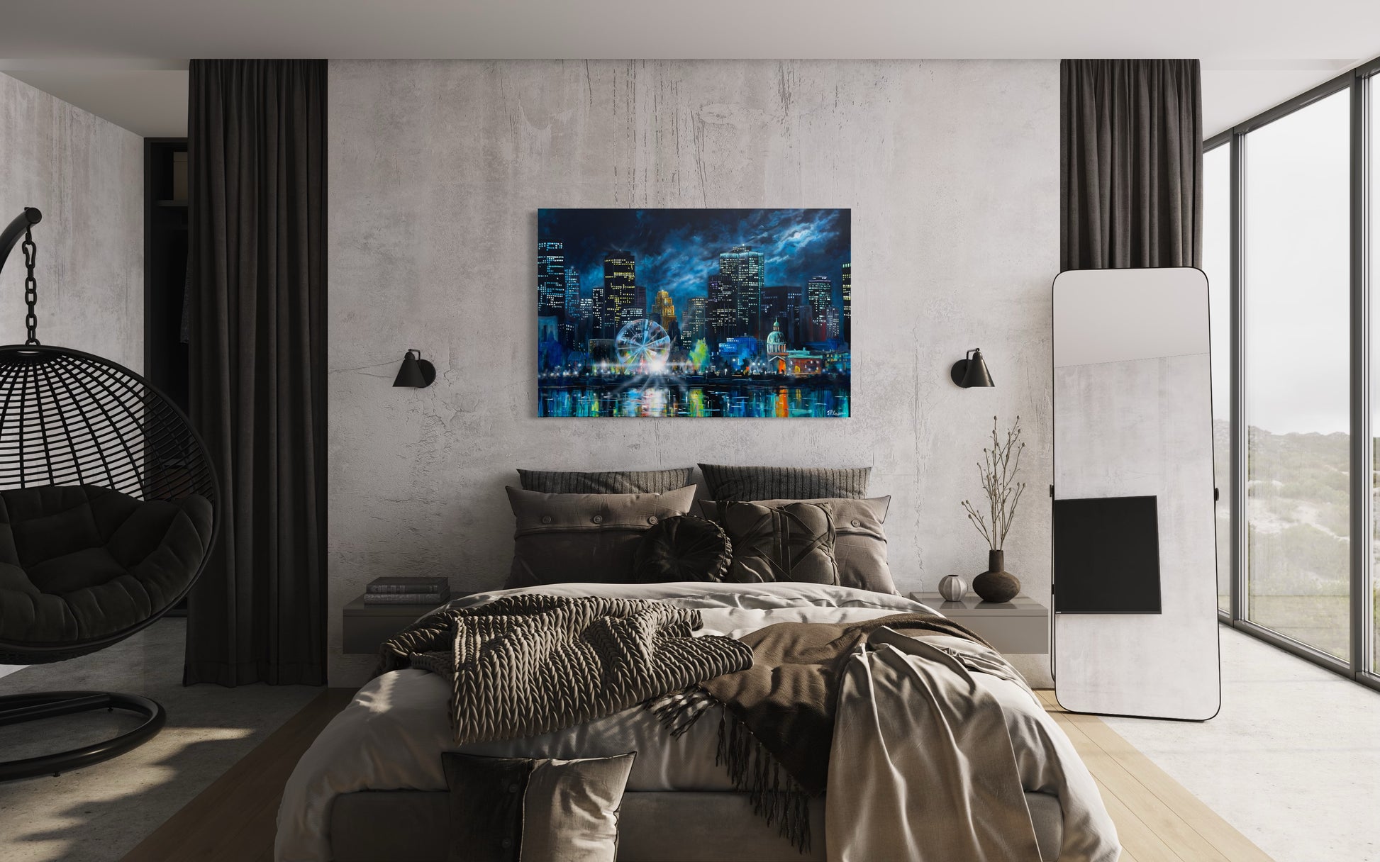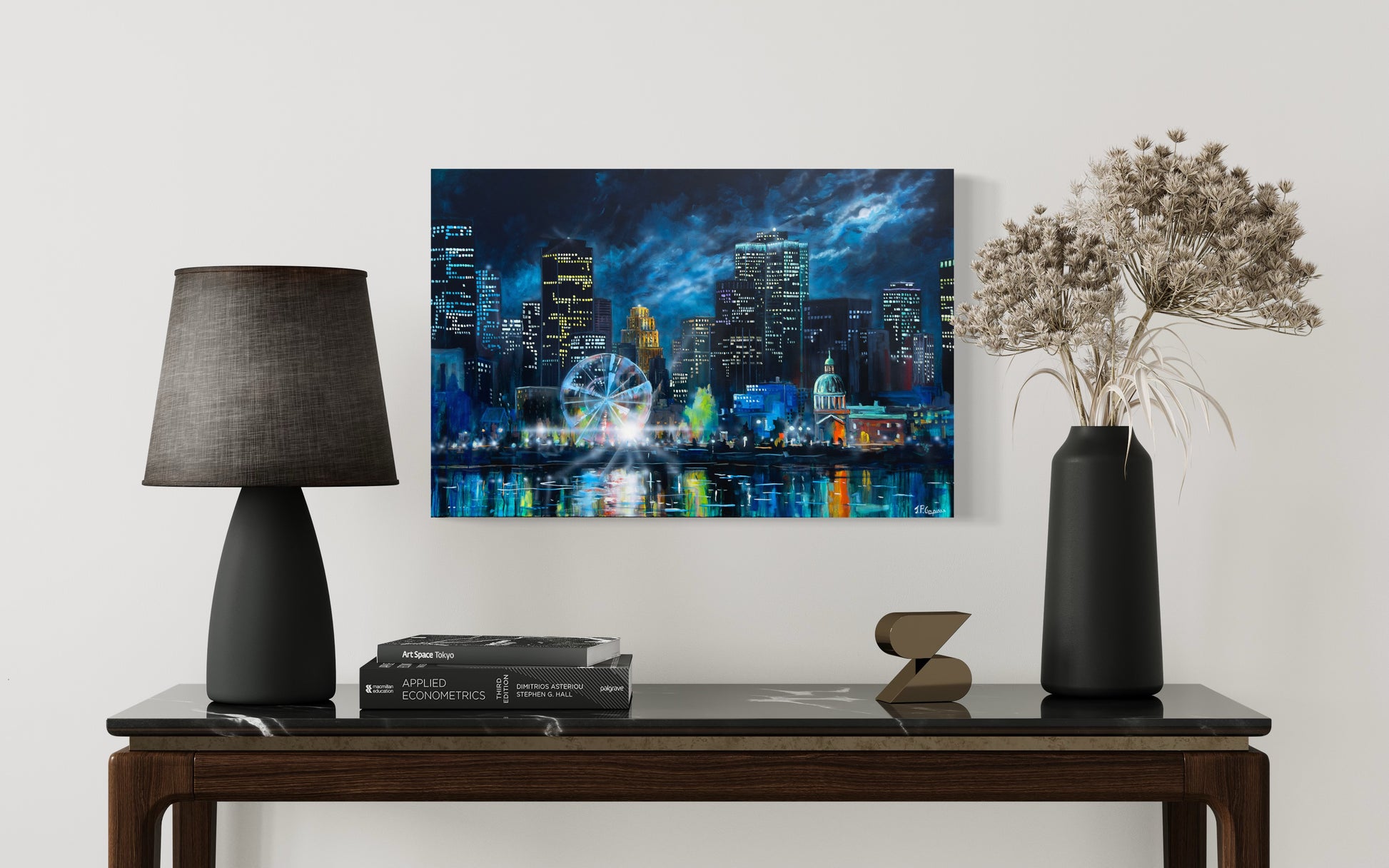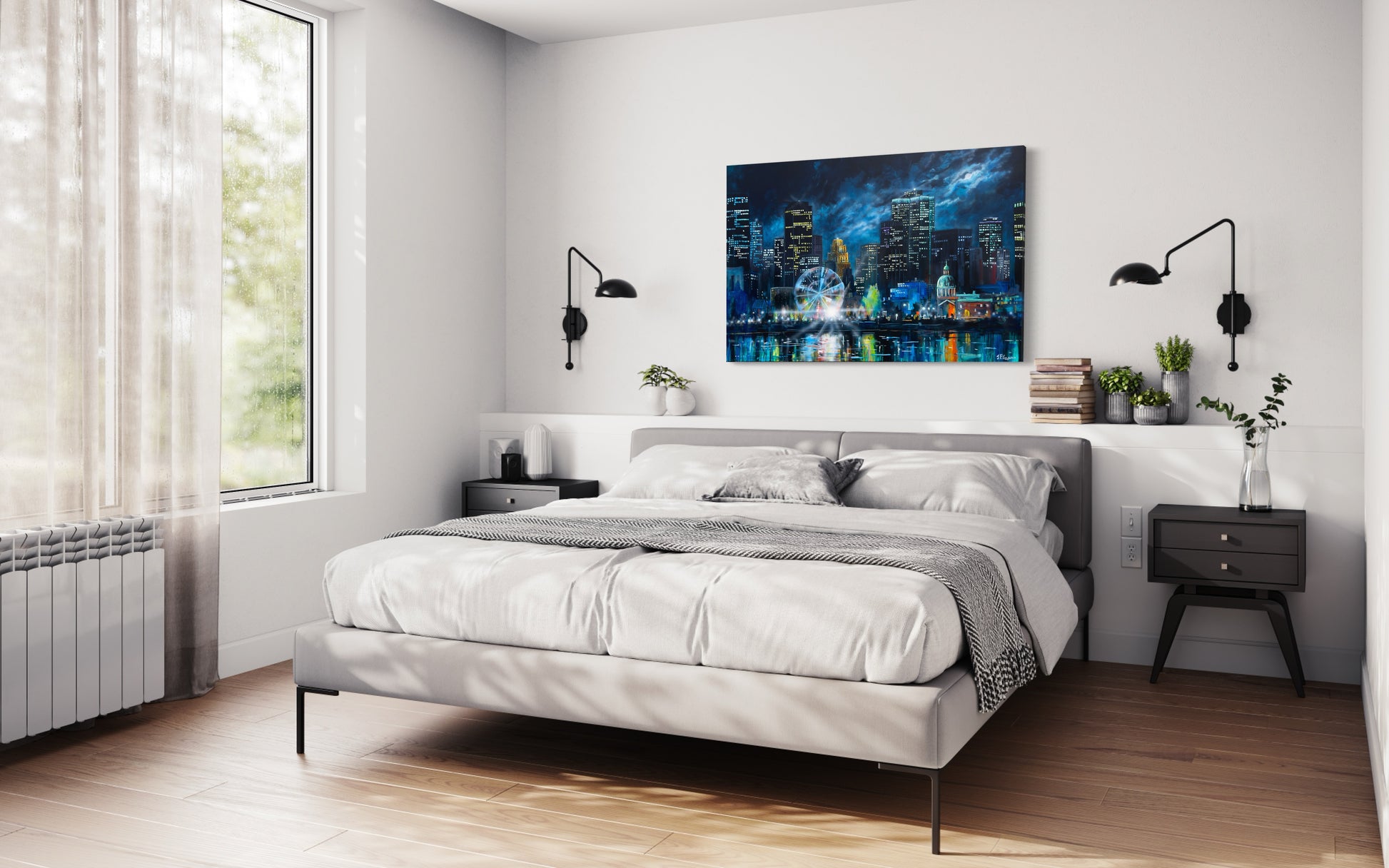 Reproduction from the “Chromacité” collection, this painting captures the nocturnal splendor of Montreal. The Ferris Wheel and iconic buildings are reflected in the water under a blue starry sky, creating a scene full of magic and color.