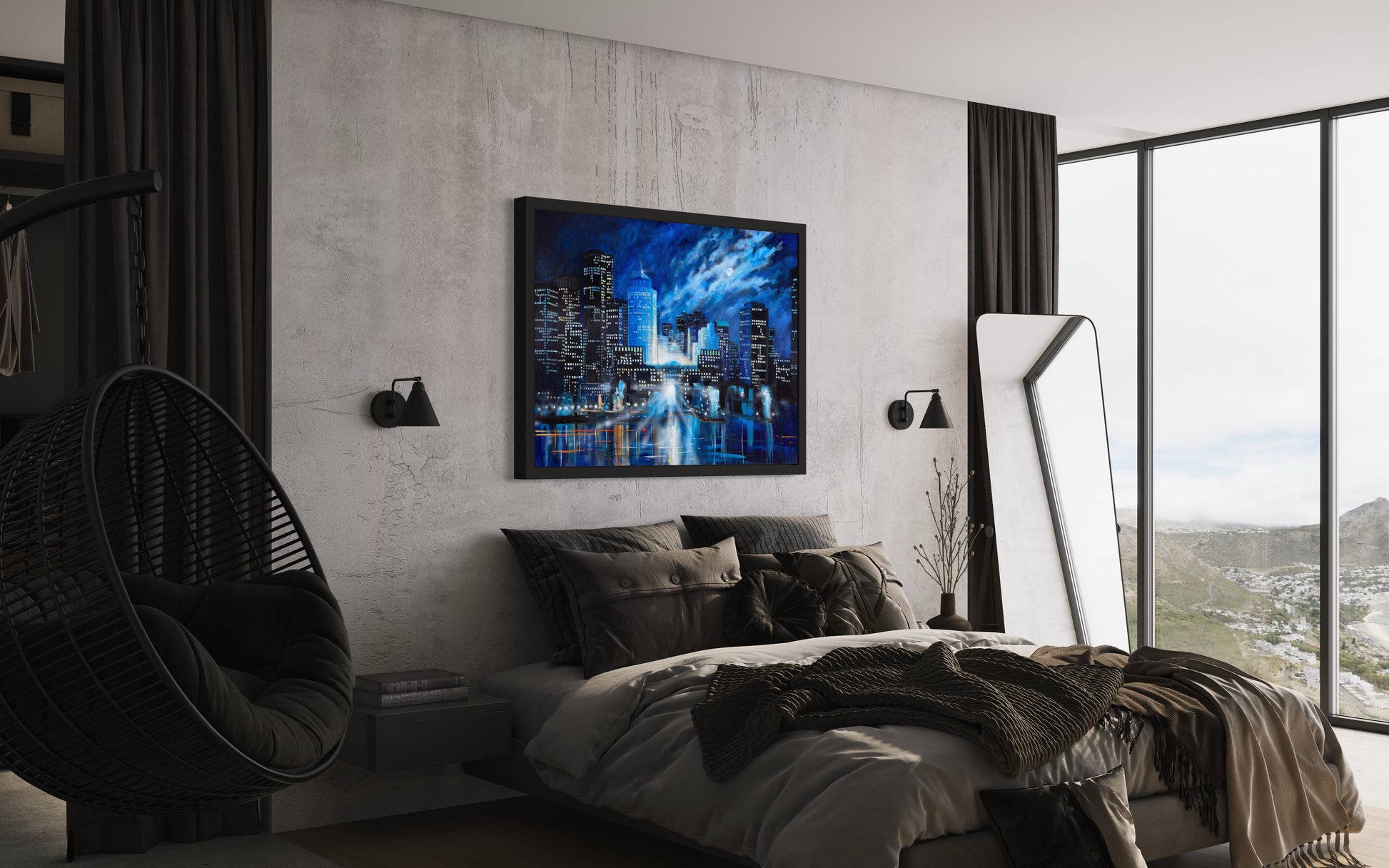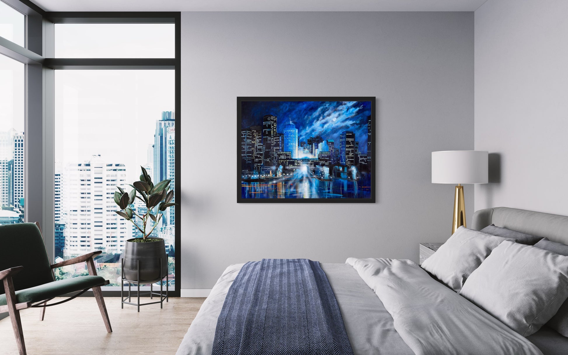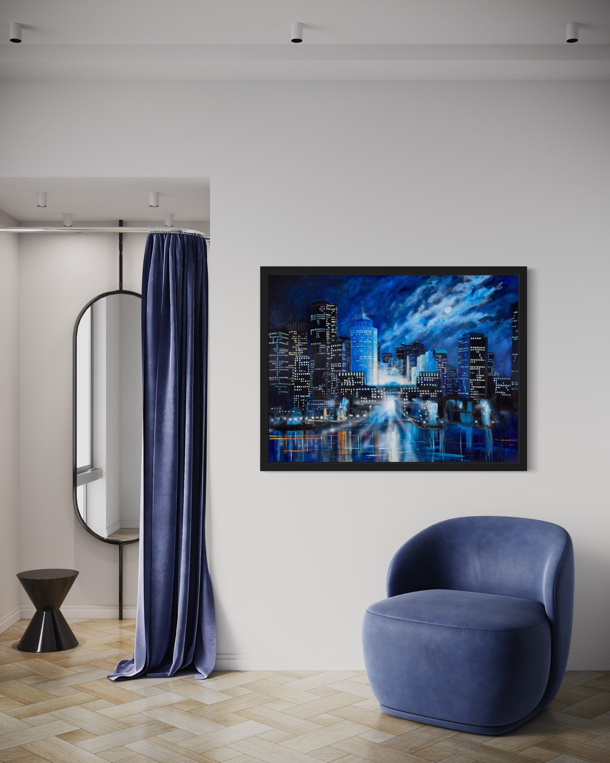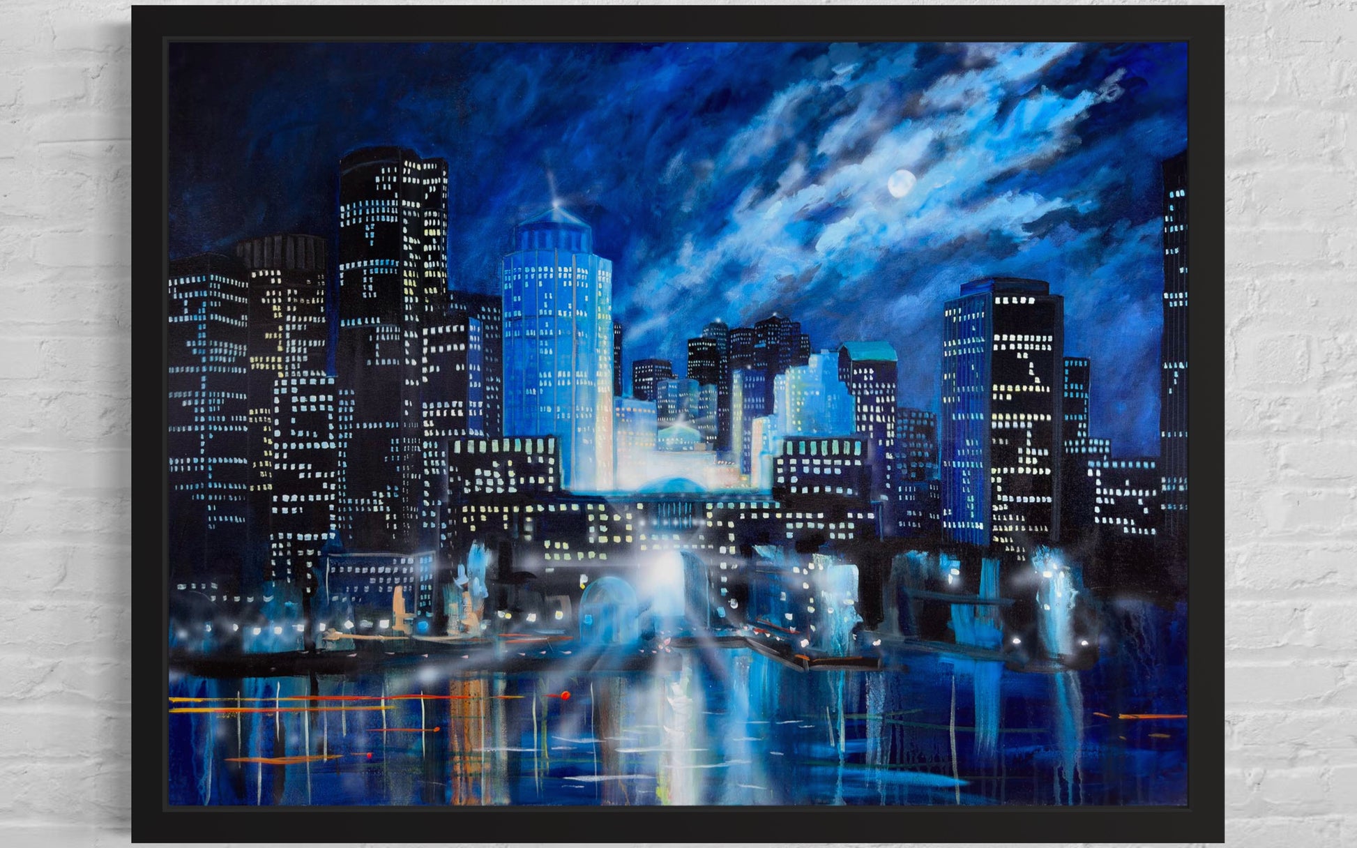 Faisant partie de la collection « Chromacité », ce tableau dépeint Boston sous un ciel nocturne éclatant. Les gratte-ciel illuminés se détachent contre les nuances de bleu profond et les reflets dans l'eau apportent une touche de magie. Les détails lumineux et les ombres délicates mettent en valeur la beauté vibrante de Boston la nuit.